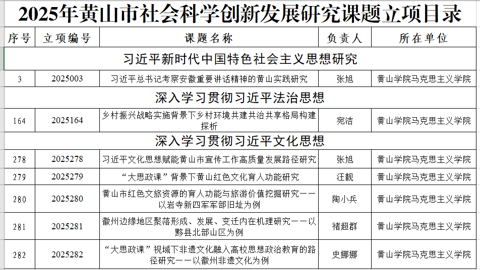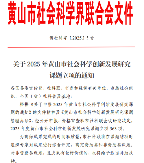 近日,2025年黄山市社会科学创新发展研究课题立项结果公布。英国365集团公司共有7项课题获批立项,其中“习近平新时代中国特色社会主义思想研究”项目1项,“深入学习贯彻习近平法治思想”项目1项,“深入学习贯彻习近平文化思想”项目5项。