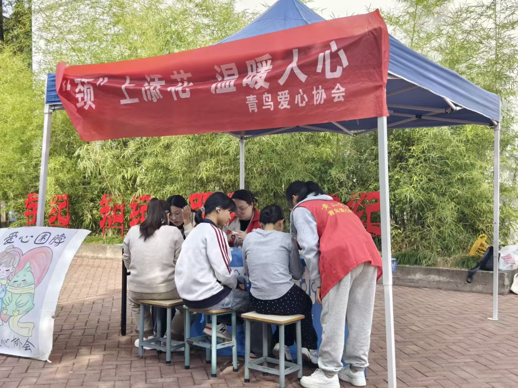 冬日渐寒,温情愈浓。为传递校园关怀、弘扬志愿精神,为需要帮助的西部青海省儿童们送去一份冬日的温暖,11月1日,青鸟爱心协会于率水校区大学生活动中心前和横江校区教学楼前同时举办“爱心围脖”教学活动。